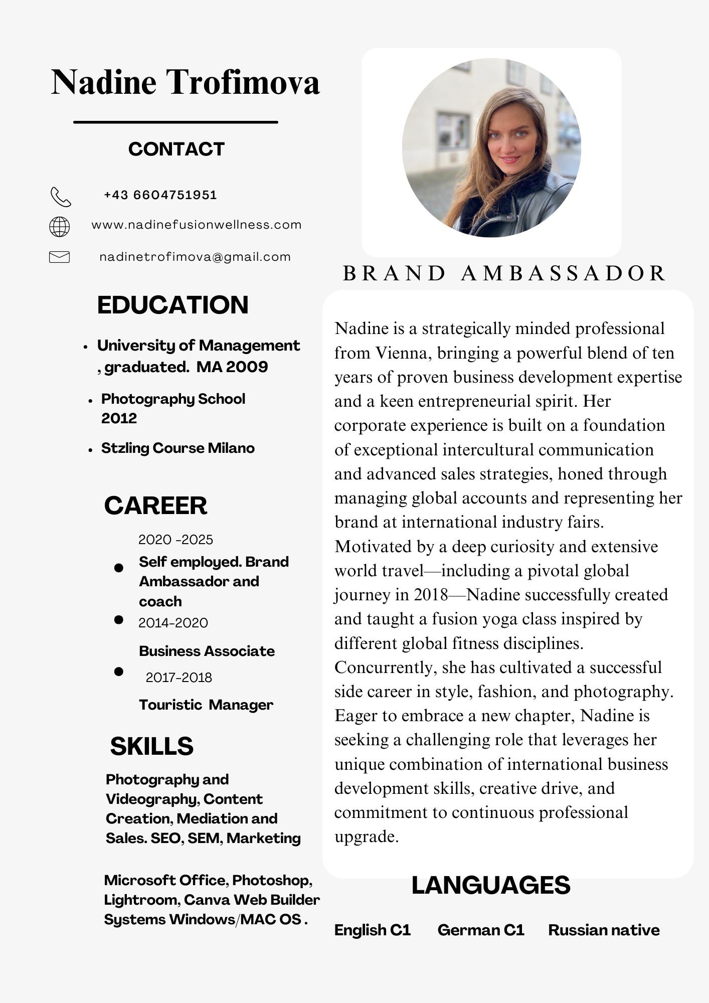 Nadine discovered photography at 21, when she bought her first camera and began capturing the world through spontaneous street scenes. What started as a personal curiosity quickly grew into a deeper artistic calling. Her early experience in front of the camera as a model sharpened her eye for composition, emotion, and storytelling—transforming her passion into a profession. She completed a photography basics course in Moscow, building a strong technical foundation before moving to Vienna, where her style evolved and matured. Surrounded by new cultures, architecture, and creative influences, Nadine refined her visual language into one defined by authenticity, elegance, and a sensitivity to human connection. Today, she creates thoughtfully crafted photosets for engagement sessions, proposal moments, reportage-style storytelling, travel photography, fashion editorials, portrait work. Her work blends natural emotion with refined aesthetics, resulting in images that feel both intimate and timeless. Each project is approached with curiosity, care, and a commitment to capturing genuine moment.